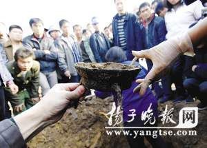 记者闻讯赶到现场时,古墓旁边已围了二三十人,在人群中央,两名妇女各拿着一把铁锹,站在一青砖砌的大坑里,挖出的长方形青砖堆在一边,旁边还有4个青瓷罐,其中一个有脸盆大小。如此完整的青瓷罐,光滑如新,吸引了许多人观看、抚摸,其中一名围观者还打开青瓷罐边上的一个黑塑料袋,发现里面竟有刚挖出来的两个青铜器,其中一个青铜器已被损坏,成了几片。