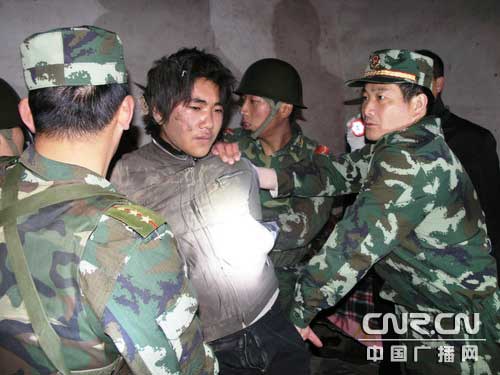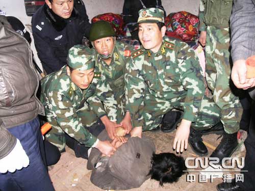 20时20分,案犯又要求其母送打火机吸烟。20时22分,在联指授意下,其母让案犯开了灯,并告之家里没有任何人,案犯放松警觉,准备开门出来。卢参谋长示意突击组做好突击准备,在案犯开门一刹那,孙参谋一手用强光疝气灯照住案犯双眼,趁案犯尚未反应过来,一手持应急棍将案犯打倒在地,参战官兵迅速将其生擒并带离现场。