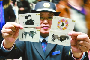 由著名艺术家韩美林设计的北京地铁首套纪念文化卡票票册,周六开始在除机场线外的7条地铁线路各站发售。地铁公司表示,本次发行的单程文化卡票,可于2008年12月6日到2009年3月1日前任意在地铁运营各线(机场线除外),各站当日使用一次,卡票在出站插卡后,闸机会自动“吐出”纪念卡票,不影响乘客收藏。(记者 韩萌 左林 摄影)