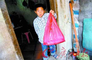 小海平日和父亲睡在一张旧式板床上。床板光秃秃的,没有草席,也没有垫子。这间潮汕老屋里没有一件像样的家具用品。卧室的屋顶早已破旧,阳光从上面的两个方孔斜射下来,照在床边。奶奶说,家中最新的东西,就是那部固定电话,不过现在已经停机了。记者在屋里发现了小海的“书包”。其实根本称不上是书包,而是一个红色的透明薄膜塑料袋。里面装着几本破旧的书,还有一沓试卷。