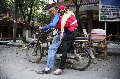 吴家芳发动摩托车在院子里等着,干完活后的石华琼跳到摩托车的后座,双手紧紧地搂着老公的腰,她要去汉旺镇上为手机充费,吴家芳则要去水泥厂干活。