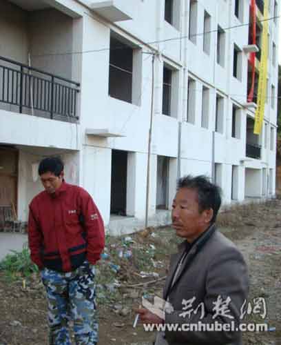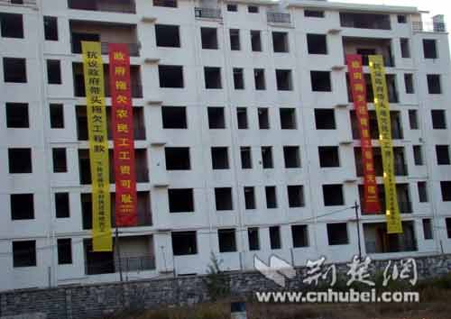 还建楼上悬挂标语称“政府拖欠农民工工资”
