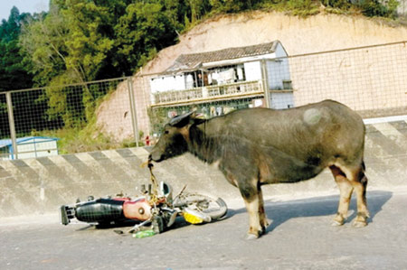 当天6时,吕先生也得到水牛的“青睐”。他说,他驾驶摩托车至古塘坳仲恺一路时,看到水牛正在路中间奔跑,突然水牛调转头对着他猛冲过来,一头顶在他的左大腿上,把他连人带车顶翻在地。他担心水牛会再次顶他,从地上爬起后,马上跑到路边。水牛没跟着他,在原地打转,原来牛鼻子上的缰绳缠在他摩托车上脱不开了。狂躁的水牛竟然拖着他的摩托车在路上跑,跑累了就站在路中间休息。吕先生马上报警。