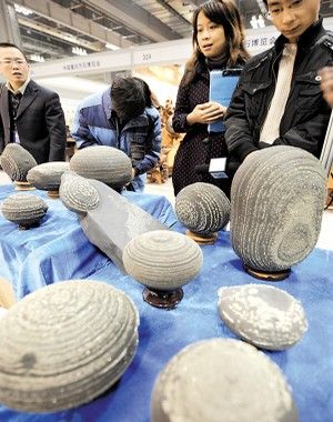 记者在现场看到,这些铁胆石石造型怪异,有的像壶,有的像铁饼,还有的像巨型恐龙蛋,表面还覆有变幻莫测的金属图纹。专家称,这种铁胆石形成于距今3亿多年间的寒武纪,科学名称叫作结核石,它是在地壳运动过程中经“物以类聚”化学作用,由某种或几种矿物质聚集而成的。“石体表面上有光彩艳丽的附着物,成分是金属硫化铁结晶,要经过千万年聚集才能自然形成。”据悉,目前市场上,拳头大的一块铁胆石价格已高达十几万元。