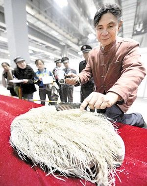 石博会上稀奇古怪的石头不少,其中最吸引人眼球的莫过于一块名为“石头公公”的怪石,这块石头上长满了白色长毛。据介绍,石上长出的“白发”是生活在潮湿地质带的一种海洋生物,其附于石上,经过亿万年的变化,逐渐向上延伸,最终形成密集如丝的直管空心状无脊椎动物化石。