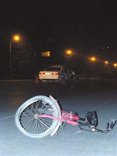 23时45分左右记者赶到事发现场时,几名交警正在勘查现场。昏黄的路灯下,公路中间躺着遇难者;几米远处,是那辆轮胎已经变形的自行车;距自行车10米远的地方,停着一辆右侧前灯处有严重“撞伤”痕迹的警用普通桑塔纳轿车,警车车牌为“川Z0189警”。