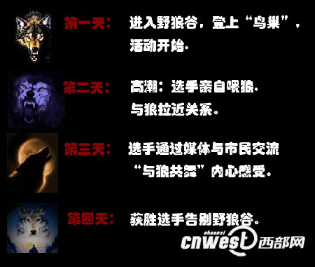 据西安秦岭野生动物园负责人任飞翔介绍,该园将在陕西省内招募三名年龄在二十二岁至四十五岁之间,写作能力强,善于使用照相机、摄像机,胆量过人且有一定户外生存经验的男士,于十二月八日进入野狼谷指定活动区域——酷似“鸟巢”的茅草棚居住三天。 期间吃、喝、拉、撒、睡均在“鸟巢”里度过。要求他们记录下野狼的活动规律、生活习性、等级序列、帮派体系,以及狼与狼之间的情爱恩怨,狼与人之间的关系和挑战者的感受。按要求完成挑战任务者,将获得五千元人民币奖金,并颁发荣誉证书。