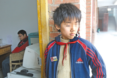 昨日,铜梁县高楼镇小学,小明站在龙老师的办公室门外 记者 钟志兵 摄