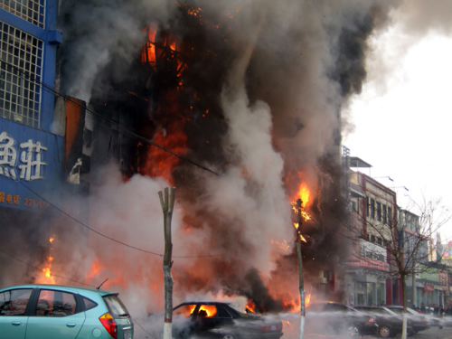 下午四点,记者从中银大道鑫源福瑞特超市出来,发现北方有大量烟雾,顺烟雾而去,在建设路口与消防车相遇,共同赶往事发地点。中银大道已经围满了人群,着火的商店火势猛烈,被烧碎的玻璃啪啪直往下掉,门前的汽车也着了,一辆为晋M89550的红旗轿车已经烧的面目全非了。