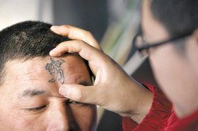 文在哪呢?他想也没想,指向了脑门。过了30分钟,一个镂空的、深蓝色的“穷”字就出现他的脑门上了,这个字花了他30元钱。