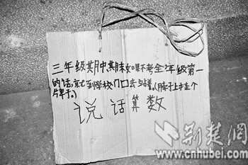 在桌子上,记者看到一块黄色纸牌,上面写着:“三年级期中、期末如果不考全年级第一的话,就到学校门口去站着。”(如图)。