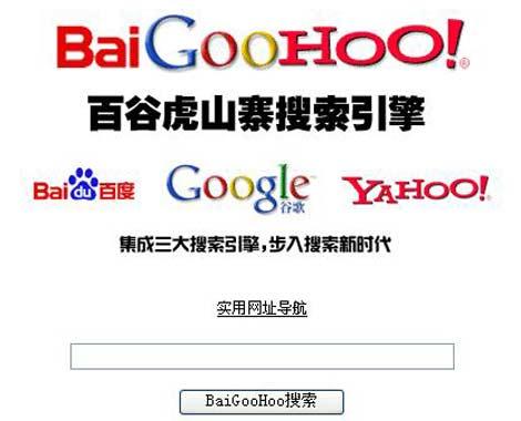 日前,一款名为“百谷虎”的搜索引擎引起了不少网友的关注,这个搜索引擎一眼看去和普通搜索引擎区别不大,但仔细一看,百度、谷歌、雅虎这三大搜索引擎的LOGO被整合成了“baigoohoo”,搜素框的上方还有该引擎的广告语“集成三大搜索引擎,步入搜索新时代”。 (11月20日《信息时报》)
