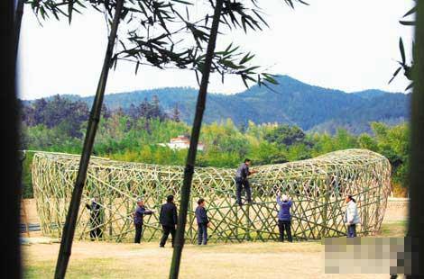 杭州双溪景区的村民仿照奥运鸟巢的造型,用了800根竹子,10多个人经过15天的手工编制,以20比1的比例制作出“竹鸟巢”,并将它作为当地乡村运动会的会场,开展沙滩排球、弓箭狩猎、滚铁圈等项目。(7月29日《天府早报》)