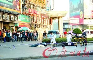 据目击者讲,当该男子从100多米高空跳下时,一老汉却骑着自行车闯进了警戒区,正好被砸中,头重重地摔在了旁边花坛的石阶上,血流不止。而跳楼的男子也当场气绝身亡。随后,120急救人员马上将被砸中的男子送往医院急救。昨晚6时50分许,记者赶到常平医院重症病房时,被砸中的老人已宣布不治身亡。