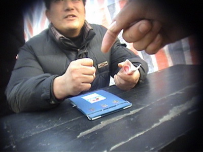 在场外的押注处,两名男子坐在桌子前,手攥一沓百元大钞,细心地在本子上记录着比赛场次、押注人姓名、押注金额。