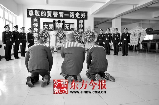 12月17日上午,(河南)省平原监狱食堂破例召开了追悼会。在监狱召开追悼会,这在全国监狱系统还是头一次。而这个追悼会,是应141名服刑人员强烈要求召开的。12月12日,曾管教他们的51岁狱警黄中文倒在了工作岗位上,他们自愿出钱,请人买了花圈,要求送一送这名好狱警。