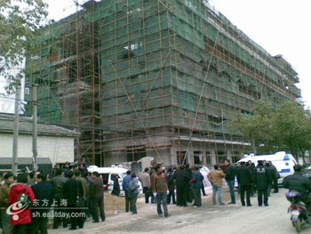 位于奉贤区金汇镇金钱公路2225号的一在建6层楼房坍塌,8名工人被埋。(图片来源:东方网)