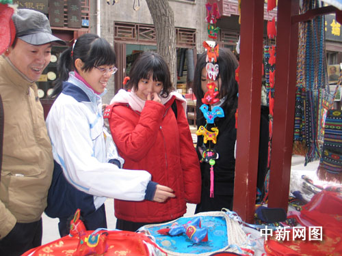 在西安标志性建筑之一——书院门,来自东京的市井亚子和寺本编绘时时被白墙黛瓦的建筑风格、古色古香的幽雅氛围所迷,不停地拿出相机拍摄。时时又被小贩出售的各式精致玲珑的旅游纪念品所迷,秦兵马俑钥匙链、福娃挂坠、小铜钟、小香包……在杨肖影和的帮助下,一番讨价后,她们满载而归,特别是福娃挂坠,每人都买了五个。