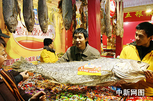 北川的羌寨腊肉、舟山的深海熏鱼、山西的平遥驴肉……,外地特色年货颇受重庆市民青睐。来自北川的年货老板李福平告诉记者,其摊位上的腌腊野猪、雪山牦牛很有特色,也大受欢迎。“不到半个小时,已卖出五条这类特色腊肉。”