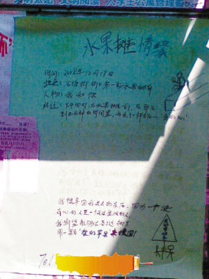 “太强悍了,圣诞节爱情宣言竟然贴到了我们女生宿舍的宣传栏上!”江南大学一名女大学生向记者报料称,该校北区女生宿舍楼下的宣传栏里出现了一张张名为“水果摊情缘”的“很强大”的求爱海报。