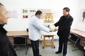 捐赠仪式上,张金宝代表同伴们从蒋卓平手中接过了画笔等绘画材料,两年来他想继续画画的心愿终于实现了。对最具天才的张金宝来说,他并不着急动笔,他摸摸自己脑袋告诉记者说:“好长时间不画了,脑子有点空,画什么我要再想想……”