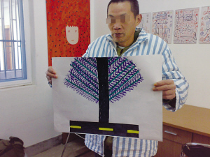 昨天下午两点钟的光景,在所有当时参加郭海平实验项目中绘画水平最令人惊叹的张金宝和另两位也画得很出色的同伴王军、张兵一起,在祖堂山精神病院八病区懒懒地晒着太阳。“又可以画画了,我就不出去找老婆了”,张金宝入院后,同样有精神病症状的爱人离家走失了,他老念想着要出院去找她。