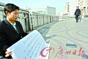 声称要“卖肾创业”的男子手持“自白书”坐在天桥上。记者王子恒 摄