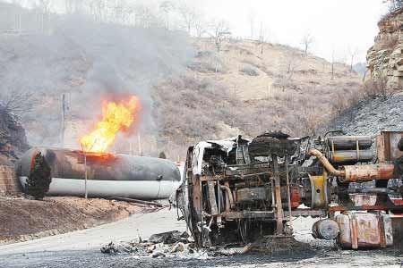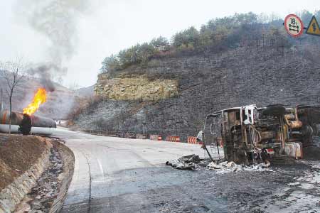 由于罐体仍在燃烧,随时有再次发生爆炸的可能,210国道此段的交通已临时封闭,截至记者发稿时,这一路段还在封闭中,事故处理还在进行中。(供稿 陕西电视台《今晚播报》)
