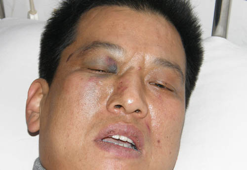 据他回忆说,12月15日下午,我在杜康花园小区尚要武家等车去灌液化气,大约4点钟左右,一伙不明身份的人(后获悉是该县刑警)闯进家中,一人搂着我脖子用手枪指着我头不让动,将我摔在地上,另一人将我皮带抽掉,又把鞋子脱掉,对我搜身,将电话拿走,我说我没办违法事,控制我的人用手枪在我头上砸了两下说:“不准说话,不许动。”此人用膝盖顶着我脖子,我呼吸困难,我说我出不来气,挣扎了一下,此人用枪在我头上砸了一下,又有一人在我胸口跺了两脚,走到我左侧朝我面部、头上猛跺,随后将我背铐手铐塞上车(非警车)。