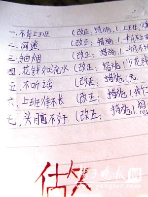 记者在浩浩家中看到了浩浩写的一些自己的缺点:“不肯上班”“网迷”“抽烟”“花钱如流水”“不听话”等等,这些字迹可能是浩浩生前最后的笔迹,也说明了他自己也意识到了自己的缺点。浩浩家的一位邻居告诉记者,黄德林夫妻四年前离婚,浩浩平时和黄德林生活,但父子两人在一起时间并不多。