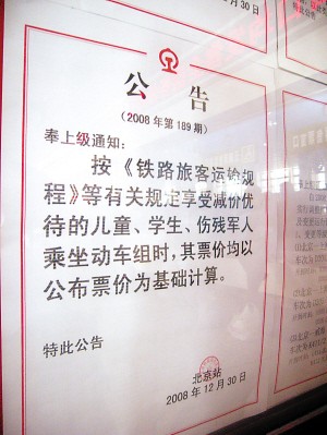 昨天下午,记者来到北京站售票大厅,在大厅的公告栏上看到,一张编号为“2008年第189期”的公告上称,奉上级通知,按《铁路旅客运输规程》等有关规定享受减价优待的儿童、学生、伤残军人乘坐动车组时,其票价均以公布票价为基础计算。
