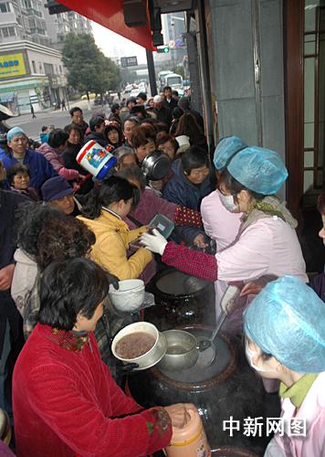 中新网杭州1月3日电(记者龚读法 实习生金斌)2009年元月3日是农历腊月初八,这一天在中国民间有喝腊八粥的习俗,杭州人也同样爱喝腊八粥。2009年的腊八,杭州的一些老字号药馆、寺庙以及社区一大早就开始免费向市民派送腊八粥,喝上一碗热腾腾的腊八粥,不但营养可口,还能祈求健康平安。