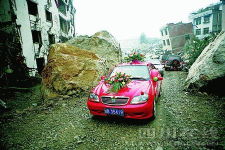眼见一对贴着大红喜字的结婚车队擦肩而过,敏锐的迟阿娟跳下车拿着镜头紧追,“我以最快速度紧追行驶的迎亲车队,差点跑断肠子……”未能打听到进一步信息,迟阿娟很遗憾:“他们说新人不能下轿,车子不能停留,新人不愿说出名字,更不愿留下电话,只是说:我们是北川人,地震虽然夺走了亲人、财产,但是,生活还是要继续!”