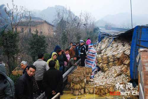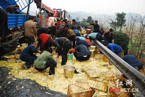 1月4日早晨6时40分,一辆满载7吨鲜鸭蛋的湖北小货车,由北往南行驶至京珠高速高速公路长潭段212公里时,因躲避快速车道的一辆汽车超车侧翻,10万多只鸭蛋倾覆在近8米长的高速公路路肩上。附近近百村民闻讯前来哄抢,现场一片狼藉。