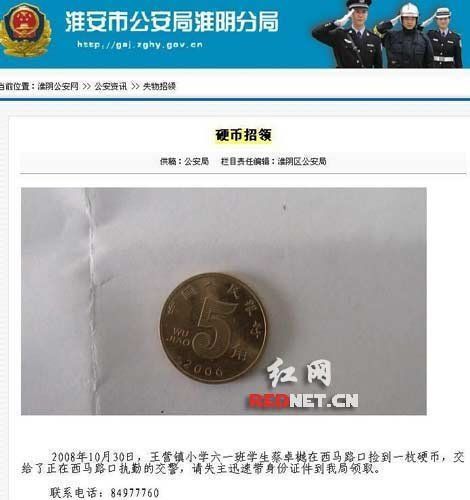 有网民发帖暴料称,本月初,在淮阴公安局网站上看到一条“雷人”的失物招领告示:“王营镇小学六一班学生蔡卓樾在西马路口捡到一枚硬币,交给了正在执勤的交警,请失主迅速带身份证件到我局领取。”启事还附有一枚略带锈迹的5角钱硬币的照片。
