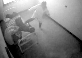 这是一段骇人的视频。视频显示一名身着白大褂的女子在殴打一位老年病人,用脚踢、用绳绑、用拖把打。视频的提供者称这是莱芜市精神病院的护士在虐待他的母亲,这位名叫王秀英的老人几天后在精神病院死亡。