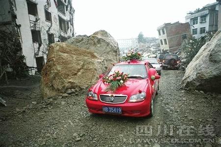 元旦节,一对北川新人,经过特许,驾着婚车横穿北川县城遗址进行了一场特殊的婚礼。