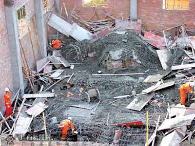 1月8日下午3时50分左右,14名施工者正在楼顶浇灌混凝土封顶,在没有任何预兆的情况下,200多平方米的楼顶轰然坠落,毫无防备的14名工人随之坠落。