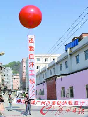 昨日上午,在广从公路黄庄一带,一中年男子买来一个红色大氢气球,升起条幅,意欲向包工头追讨3万余元报酬。