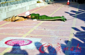 据现场消防官兵介绍,下陷的大坑有七八米深,因为事发地段为填海而成,加上旁边有施工工地,泥沙流失可能是其下陷原因,担心路面出现更大面积下陷,消防救援官兵所开来的专业吊车一时不敢靠近洞口。