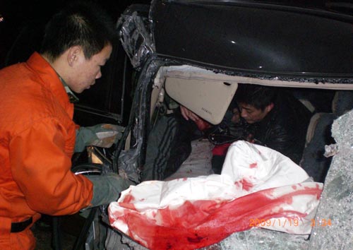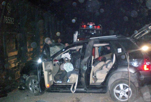 凌晨3时14分,接到报警后,漯河源汇区消防大队特勤中队中队长彭中明立刻带领一部抢险救援车10余名队员火速赶往事故现场。距离现场50米外,就能看到一列长长的火车停在南环路中间,把进入漯河市区内的几条主要通道牢牢堵死,造成进出漯河的几辆汽车无法通行。来到事故现场,只见一辆小轿车的车头被撞得面目全非,挡风玻璃被撞碎,车前的引擎盖被撞得凸了出来,一名40多岁的司机满脸是血,嘴里不停地发出微弱的呻吟声。由于他的双脚被卡在变形的车体内,现场的交警经过多次努力最终没能将其救出。