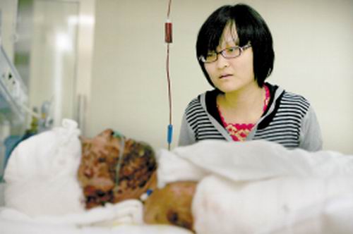前几天,在南京打工的父亲重度烧伤,南京医院给她打来电话,说她父亲病危。她以为是骚扰电话,晚三天才赶到南京,从几千里外,将已烧得不成人样的父亲运回故乡,送到吉林省武警总队医院。如今,为了给父亲筹集医药费,20岁的她又踏上打工路。