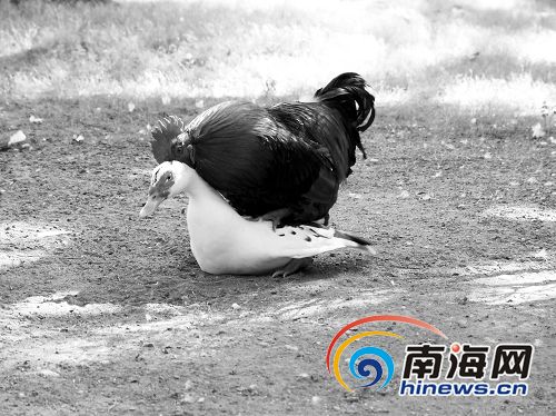 近日,在定安县的海南热带飞禽世界园区里发生一件稀奇事:一只公鸡居然恋上了一只母鸭(见上图),并在和别的公鸭一场大战后,赢得了母鸭的“芳心”。在定安热带飞禽世界里,记者见到了这对奇异的“情侣”。