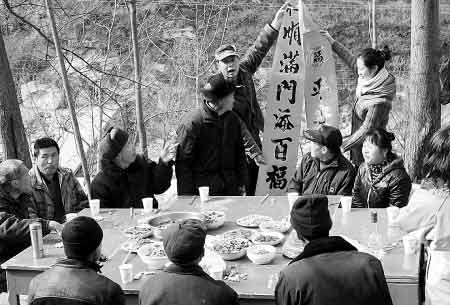 这一桌丰盛的酒菜,是常年在长安区大峪口龙石沟利用业余时间义务植树造林的郭建民一家精心准备的,专门宴请龙石沟的15户村民一同提前吃年夜饭。