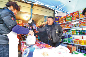 在这个市场里,几乎所有的年货都能买到:糖果、瓜子、蔬菜、水果、鞭炮、烟酒……连网吧和复印店,都能在市场里找到。