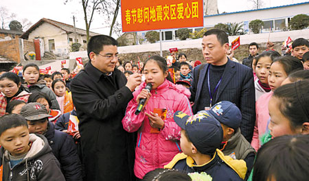 昨日下午,陈光标率领由全国63位企业家组成的“春节慰问地震灾区爱心团”,来到德阳市中江县龙台镇,在龙台中学和兰渡小学开展慰问活动。