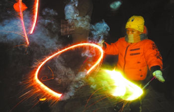 两名年轻的小伙子在金台路上点燃了一挂5000响的爆竹,然后一人骑上自行车,另一人跳上后座,并用手拖着鞭炮前行。鞭炮在自行车前行的线路上“滑行”,宛如一条绚丽的丝带。