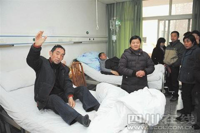 侄儿罗介平从前面点的平台绕下山崖,准备将罗从阳救上来。这时的罗从阳意识还算清楚,躺在地上活动了一下四肢,感觉都没什么问题。在罗介平的帮助下,罗从阳才回到路上。“滚下来的中途有一些竹子挡到,我觉得就是头晕。”罗从阳被山崖上的碎石磕伤了头部和面部,满脸是血的他让上面等待的亲人看得揪心。他还不太相信自己是被猴子推下去的。当地好心的村民代有兵(音)闻讯赶来把罗从阳背下了山,罗家和两名西岭雪山风景园区管委会的工作人员,将罗从阳送到了大邑县人民医院。经过检查,他头部的伤并没有大碍,缝合10余针住院观察几天即可。