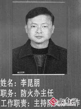 李昆朋,男,1972年12月出生,大专文化,晋宁县昆阳镇人。1988年9月参加工作,2003~2004年任县林业局扑火队队长,2005年以后任晋宁县林业局防火办公室主任。