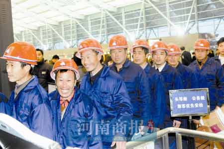 昨日早上7时许,郑州新郑机场里走进一群身穿工作服、头戴安全帽、肩上扛着编织袋的农民工。他们刚一走进候机大厅便引起候机乘客的注意。